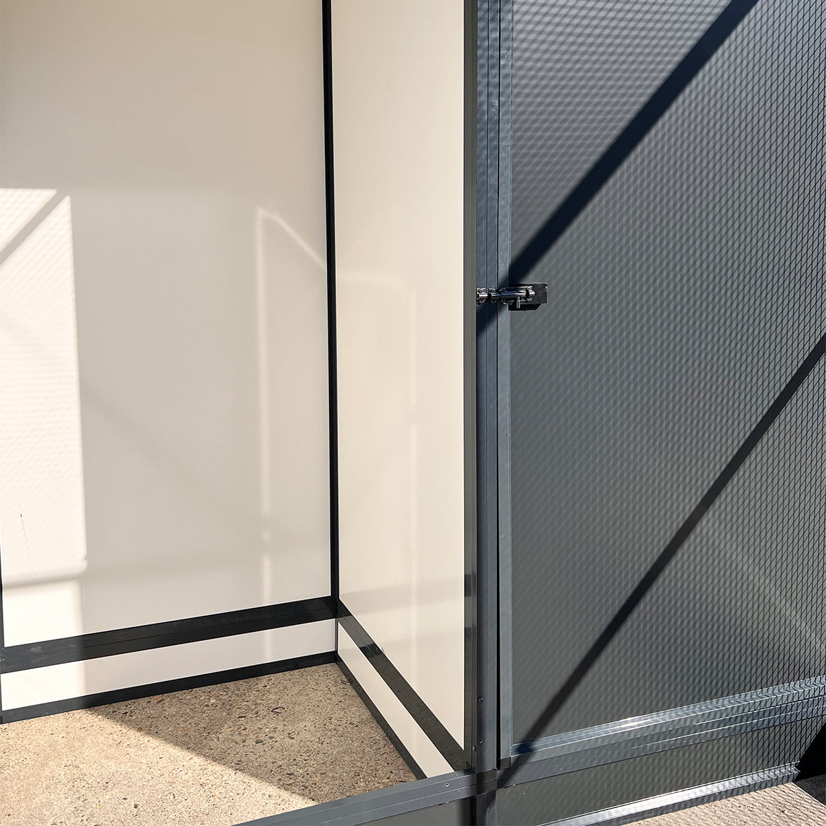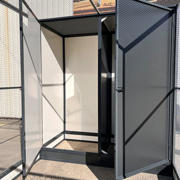 De volière is opgebouwd uit onderhoudsvrije aluminium panelen. Het nachthok en de sluis zijn vervaardigd uit ACP-panelen, die eenvoudig te monteren zijn. Aluminium zorgt voor een lange levensduur en een strak, stijlvol uiterlijk.