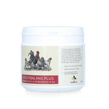 Tijdens zomerse temperaturen verliest de kip veel elektrolyten die belangrijk zijn voor de kip. Farmidi Vochtbalans Plus helpt het elektrolytenverlies te herstellen. Ook helpt Farmidi Vochtbalans Plus bij het herstel na ziekte. De zouten zorgen er voor dat de kip weer beter gaat eten en drinken.