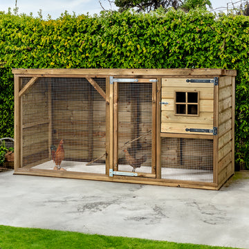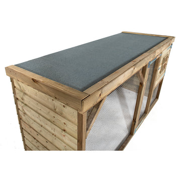 Het verblijf is gemaakt van geïmpregneerd grenenhout en heeft een bodemplaat van betonplex, waardoor het kippenhok bestand is tegen slijtage en weersinvloeden. Het dak is voorzien van dakleer voor extra bescherming tegen regen en zon.