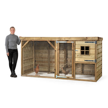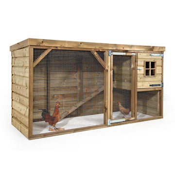 Het verblijf bestaat uit een comfortabel nachthok met interne legvakken, waar je de eieren eenvoudig kunt rapen en waar de kippen hun eieren kunnen leggen. Daarnaast beschikt het kippenhok over een overdekte ren met een plat dak wat schuin afloopt.