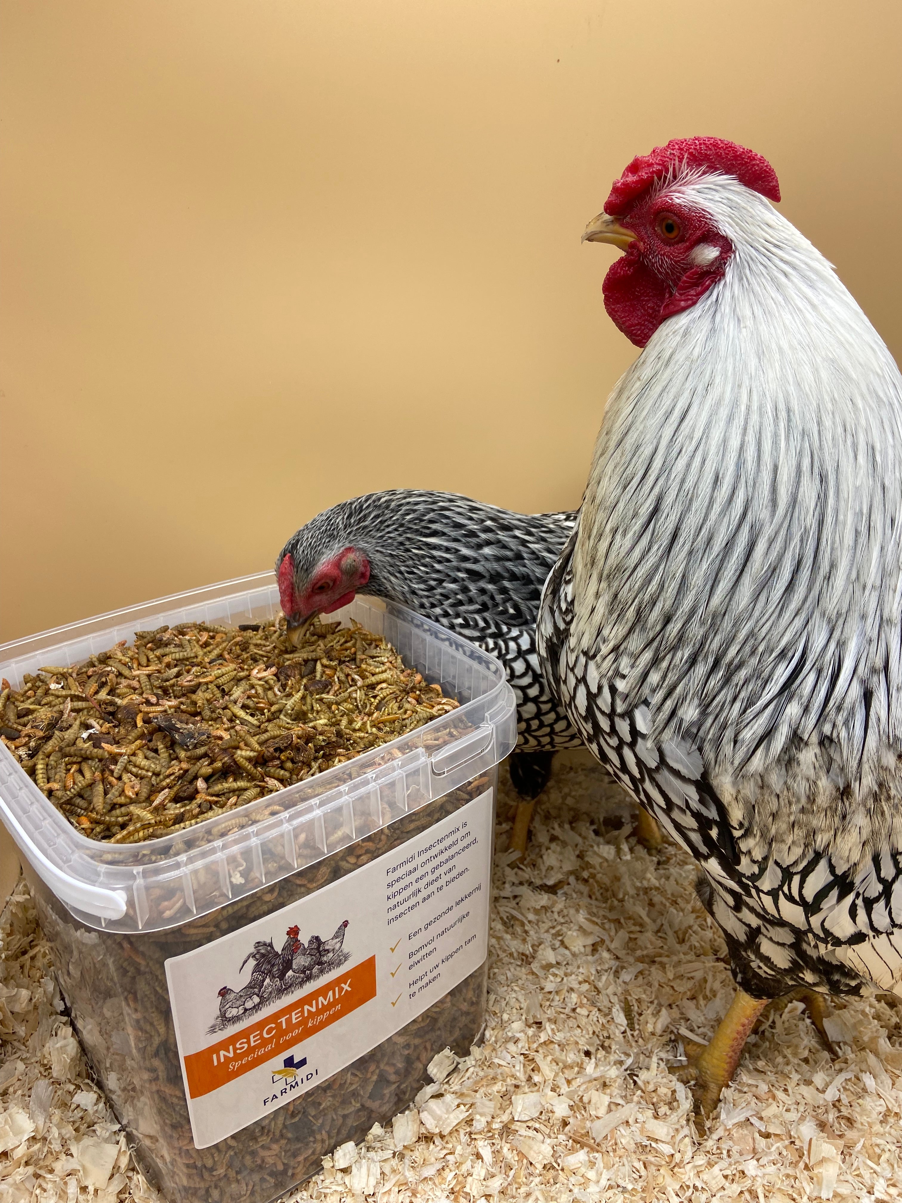 Geef iedere dag een handje Farmidi Insectenmix per kip. Natuurlijke eiwitten zijn belangrijk bij de groei van de kippen en voor het leggen van gezonde eieren. Deze natuurlijke eiwitten helpen de kip ook om een gezond en mooi verenkleed aan te maken.