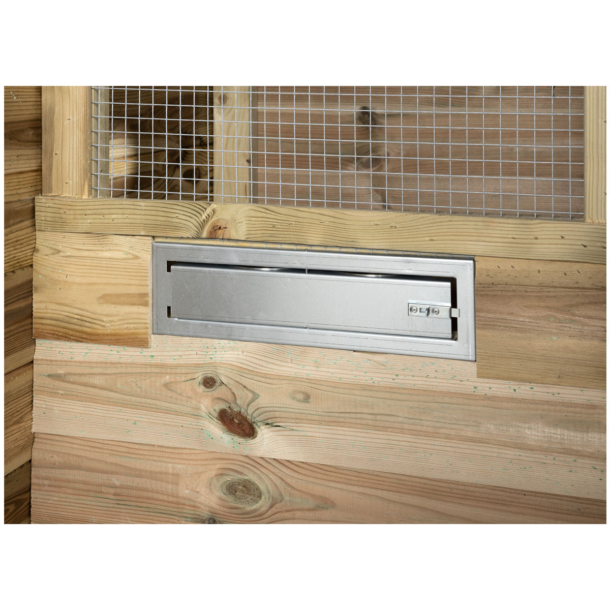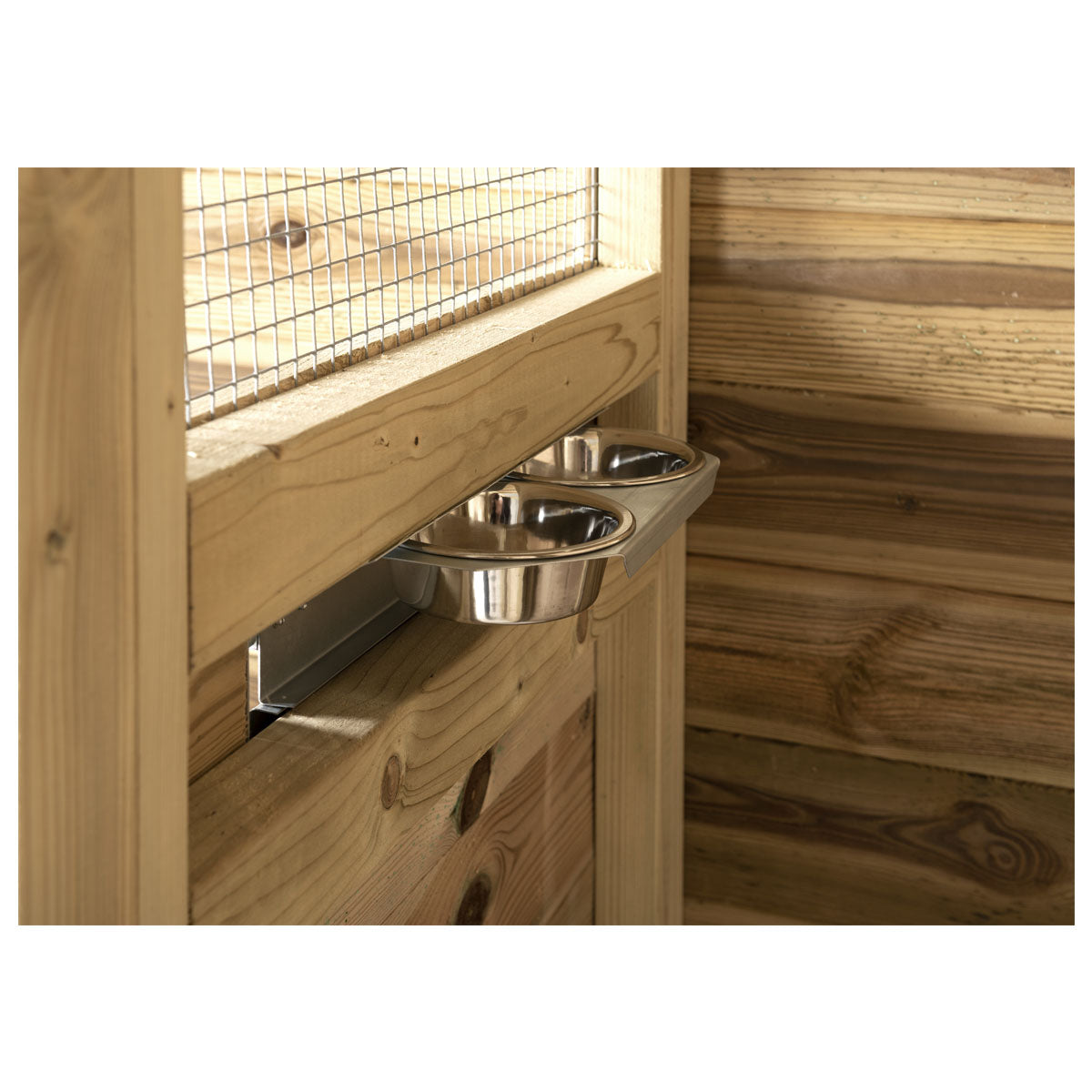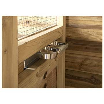 Daarnaast is de volière uitgerust met een twee-baks voedersysteem, waardoor de vogels eenvoudig gevoerd kunnen worden zonder dat zij kunnen ontsnappen. Dit maakt het verblijf extra praktisch in gebruik.
