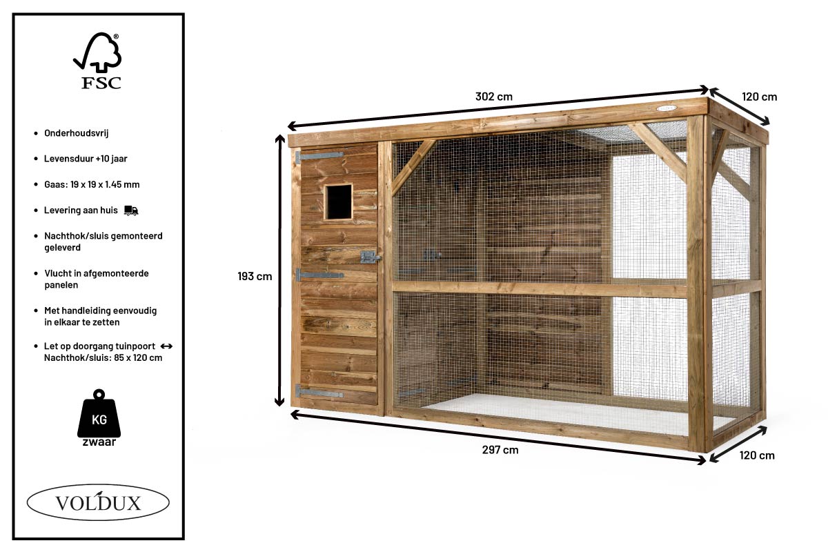 VOLDUX Volière Toon is de ideale keuze voor wie op zoek is naar een duurzame, veilige en ruime houten volière met professionele afwerking.