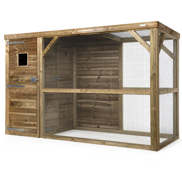 De volière is volledig vervaardigd uit geïmpregneerd hout, waardoor het verblijf onderhoudsvrij is en uitstekend geschikt voor buitengebruik. Dankzij de degelijke afwerking en het gebruik van kwalitatieve materialen ben je verzekerd van een stevig, veilig en duurzaam dierenverblijf.
