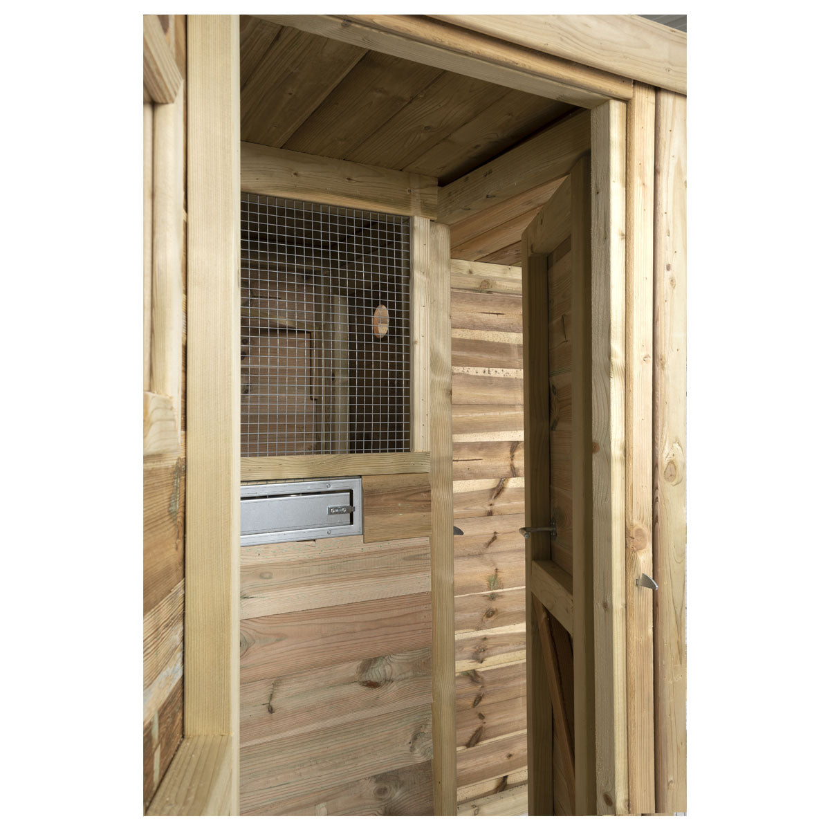 Deze grote volière beschikt over een ruim nachthok met sluis, voorzien van een dubbele toegangsdeur om ontsnappen te voorkomen. Hierdoor kun je de vogels veilig verzorgen en het verblijf betreden zonder risico.